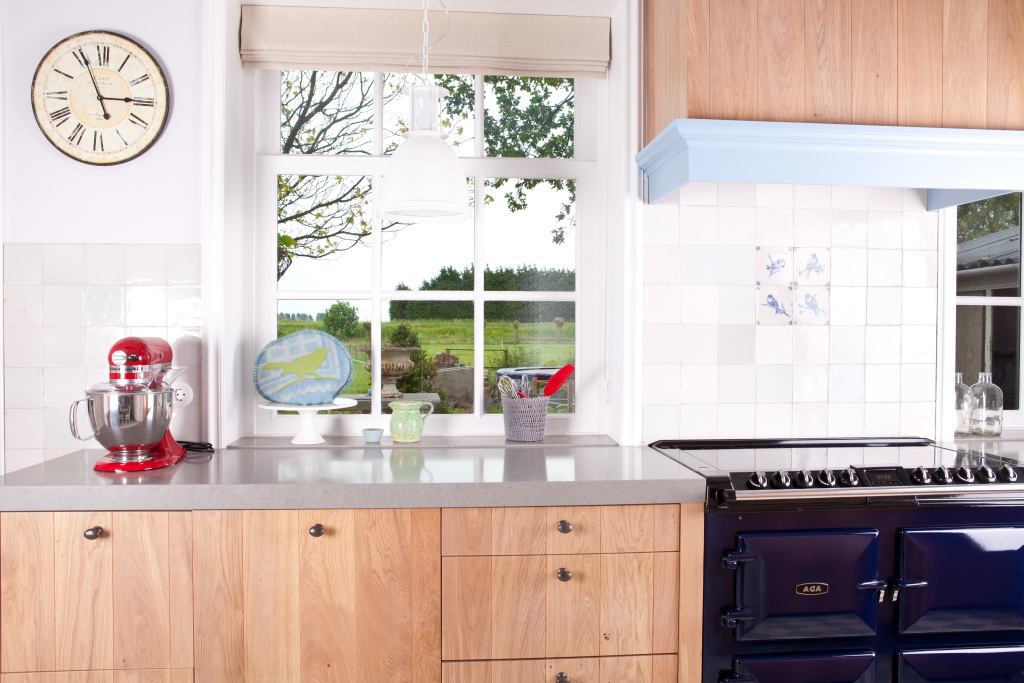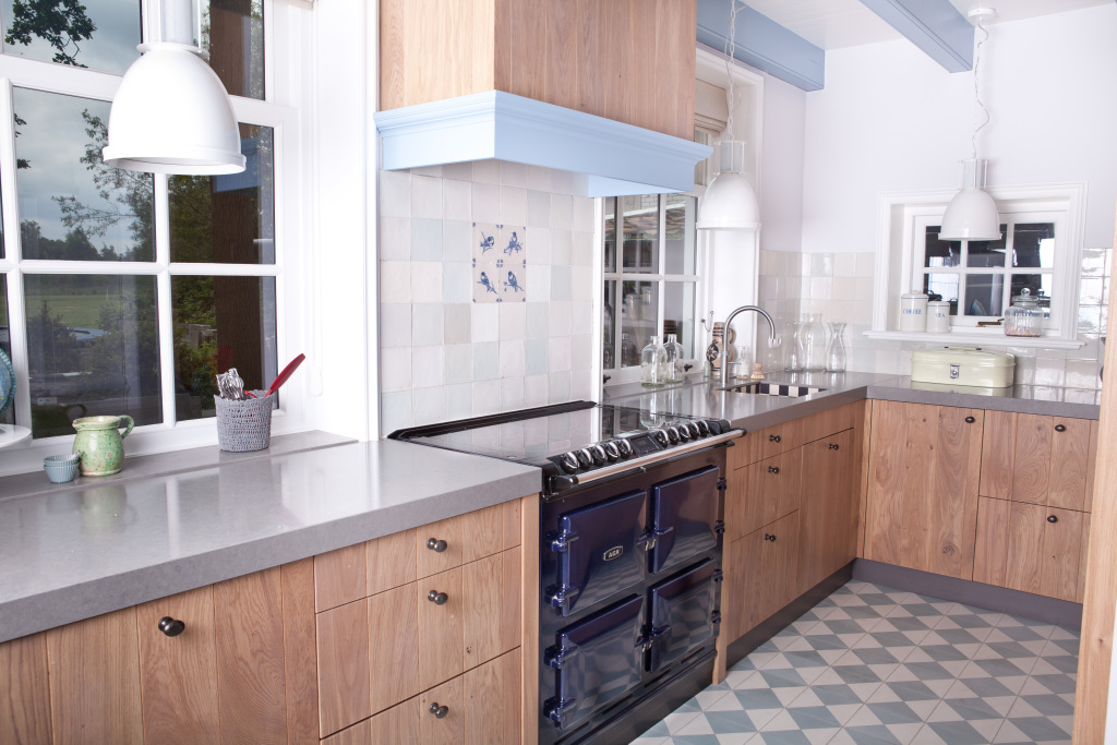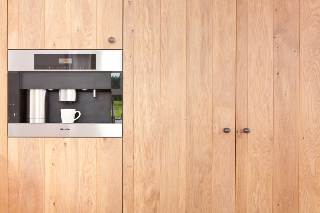 Keuken met massief eiken deuren en zijpanelen in een monumentaal boerderijhuis.